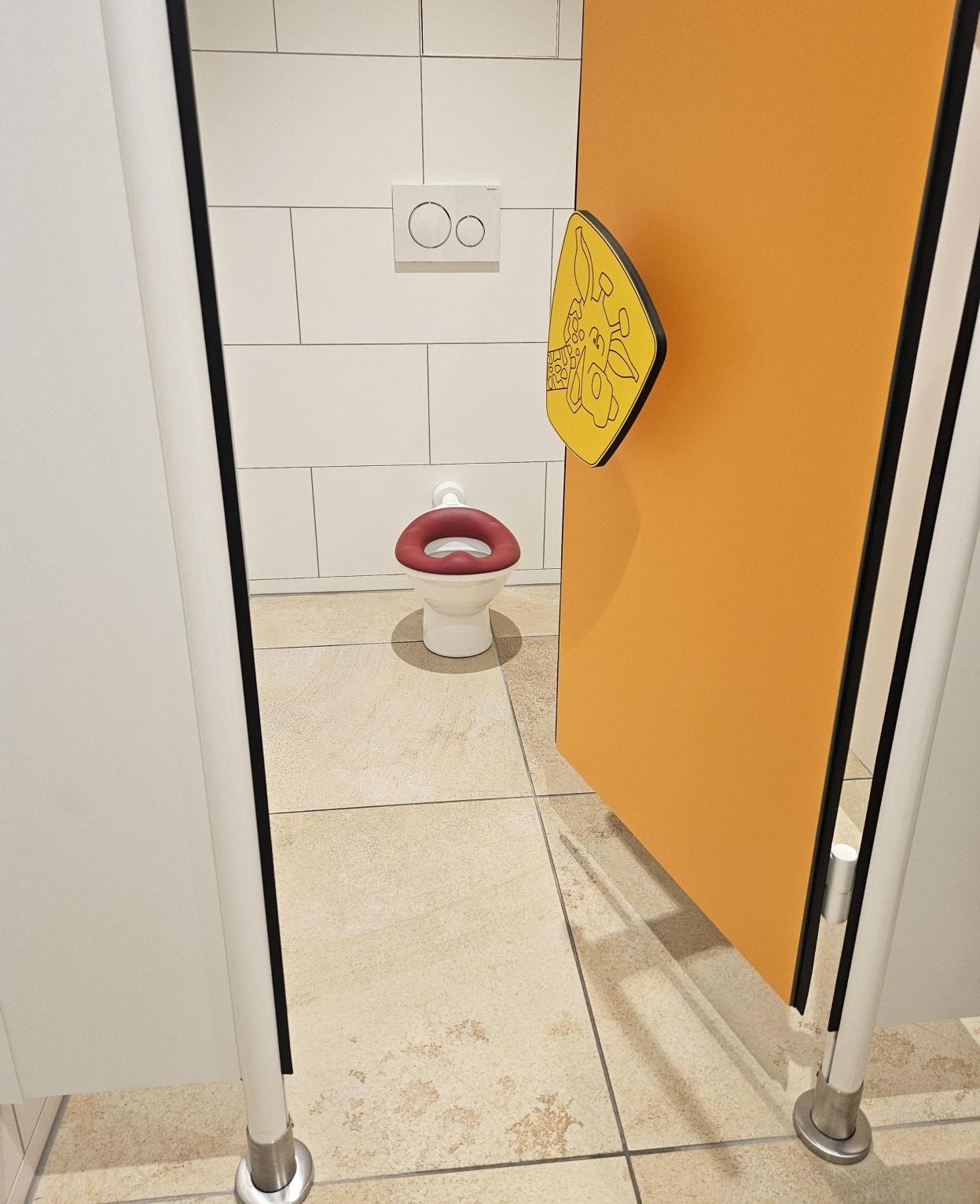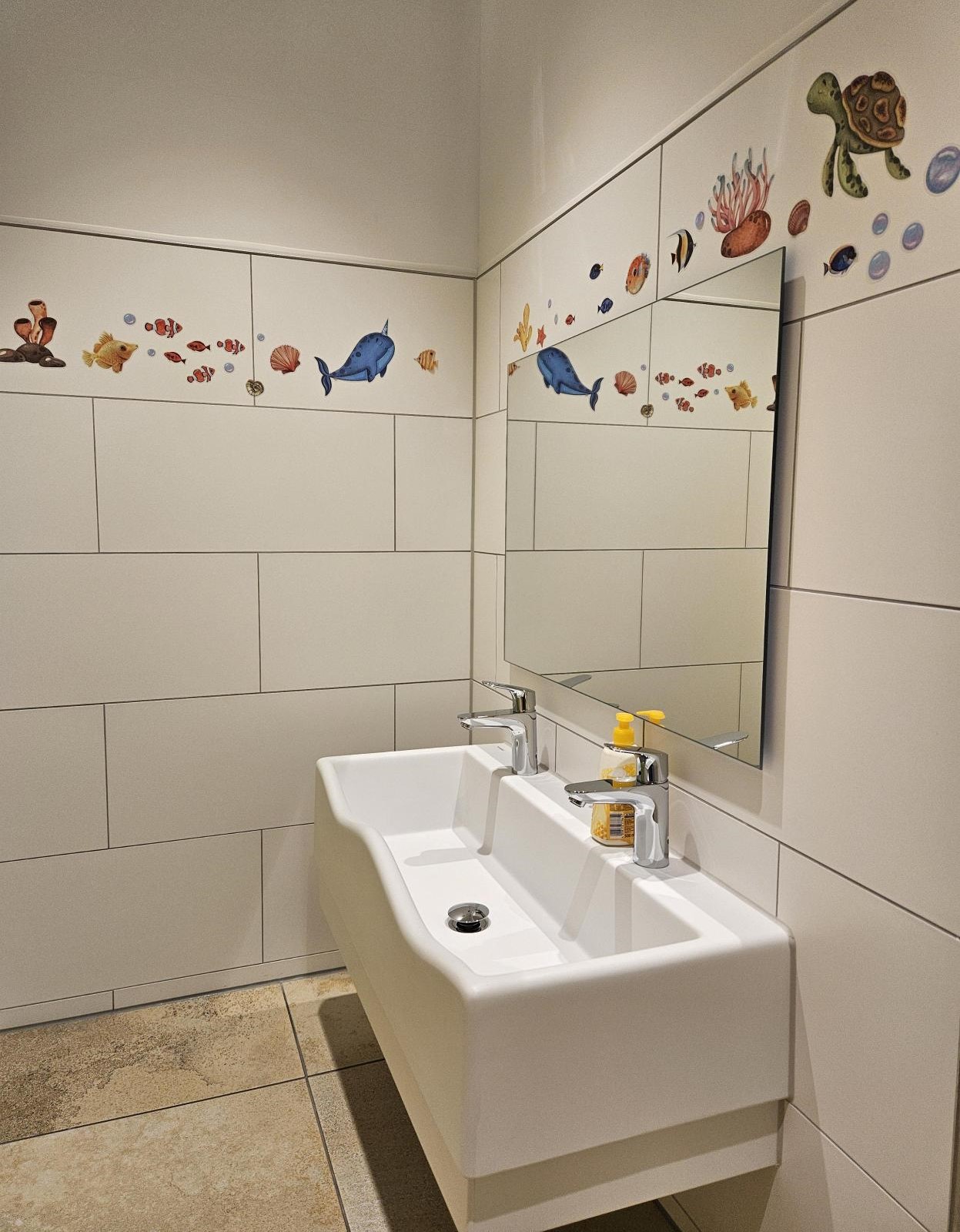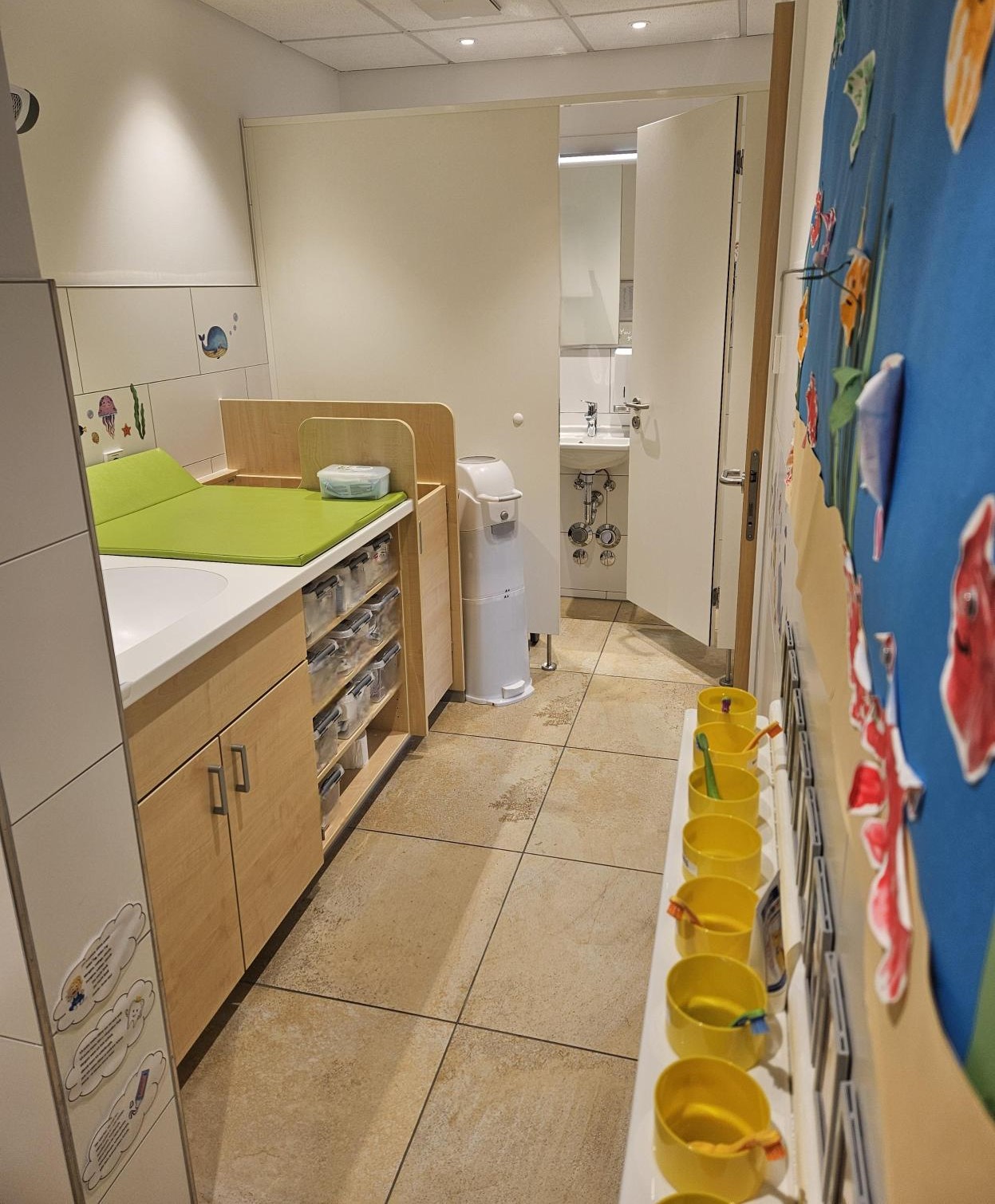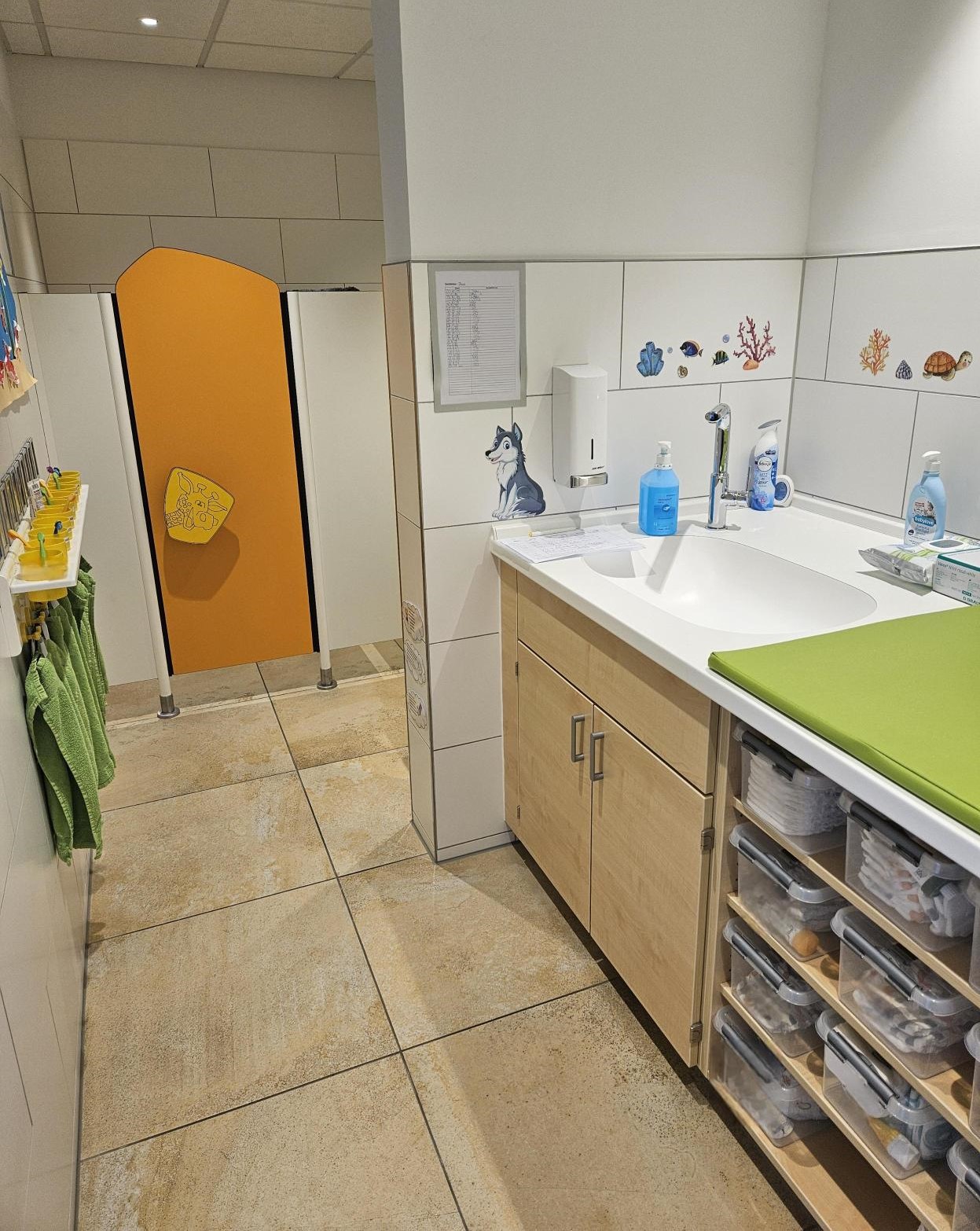 Der Waschraum grenzt direkt an den Gruppenraum an und kann durch die Kinder selbstständig begangen werden. Uns ist es ein großes Anliegen den Kindern Hygiene im Alltag zu vermitteln und sie bei dessen Ausübung z.B. Hände waschen zu begleiten. Die Tür zum Waschraum ist mit einem Fenster versehen durch welches die Kinder einmal das Geschehen im Gruppenraum beobachten, aber auch vom Gruppenraum in den Waschraum sehen können.