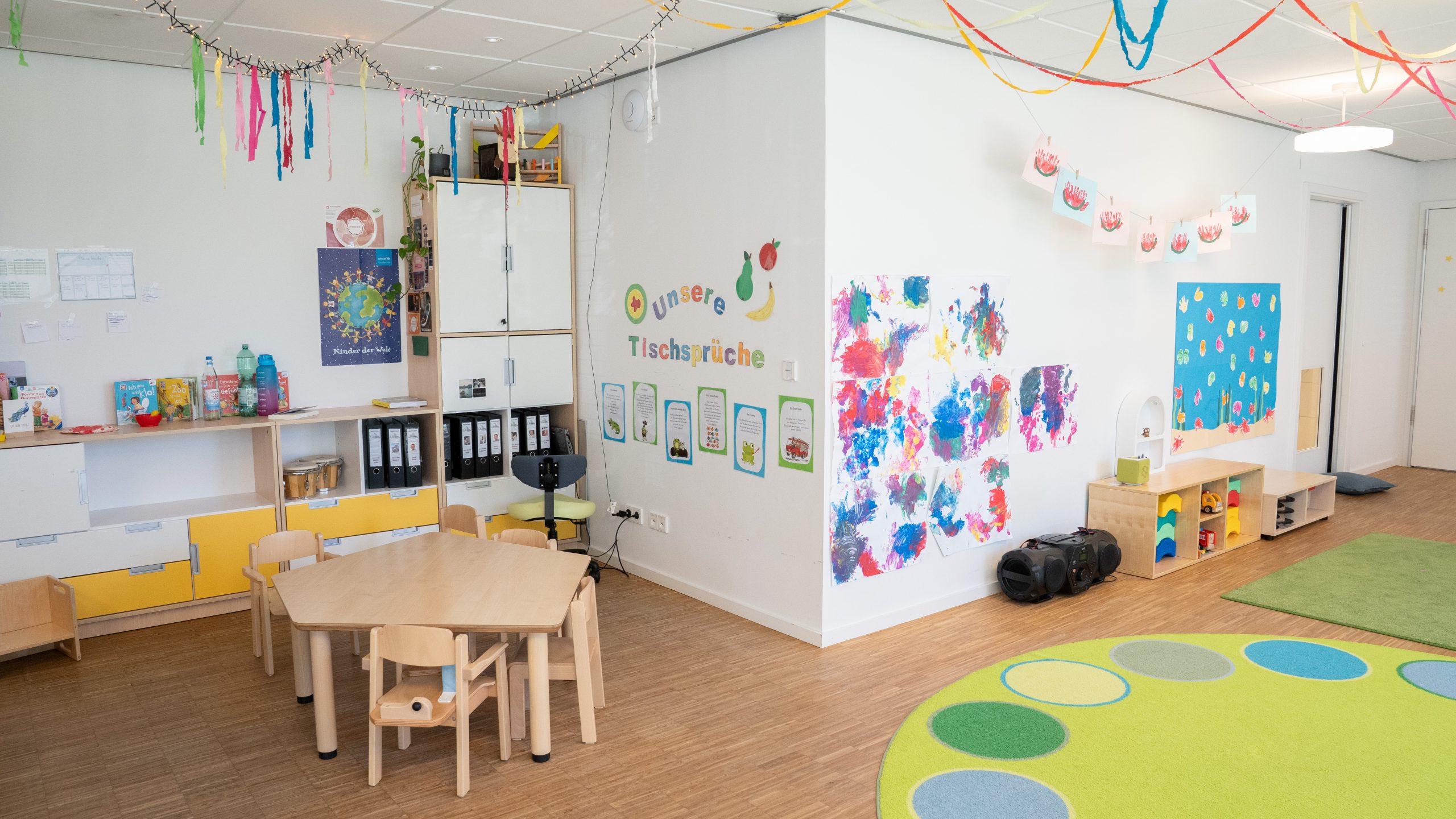 Die Kinder sollen möglichst schnell nach Betreten der Gruppe einen Überblick über das Geschehen im Raum erhalten können, daher verzichten wir auf große Abtrennung der einzelnen Spielbereiche.