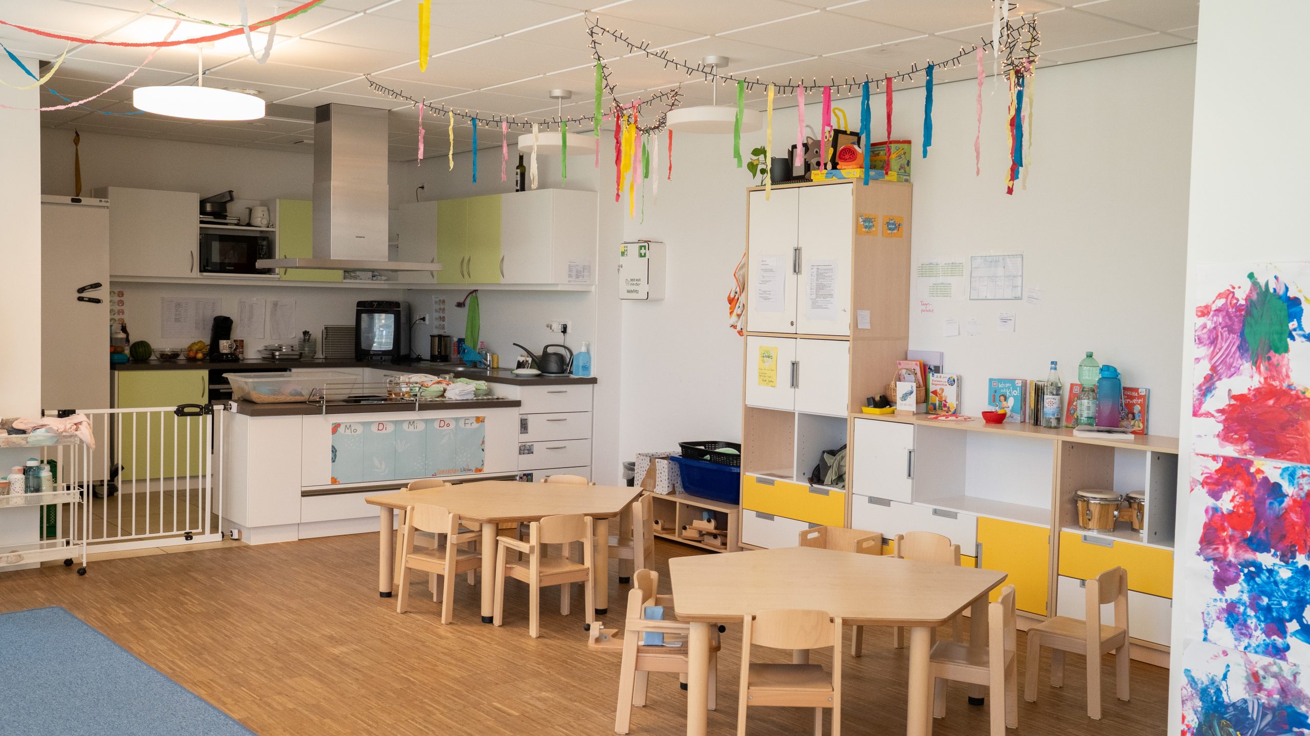 Der Gruppenraum ist nur durch eine Kücheninsel von der Küche getrennt. Die Kinder haben somit immer Einblick in die Küche und können auch die Zubereitung des Essens mitverfolgen oder aber aktiv mithelfen. Durch Podeste und Absenkung der Küche im Bereich der Kücheninsel ist es den Kindern möglich immer in der Küche aktiv zu sein, sei es beim Backen oder Herrichten vom Frühstück, Mittagessen oder Vesper.